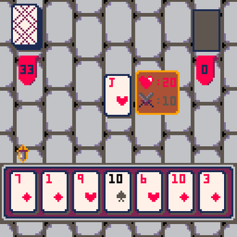 You are battling all the face cards in the deck. Each face card has health and attack as well as their suit. You are able to strike back by selecting a card and doing some damage. The face card while out negates their suit effect.f